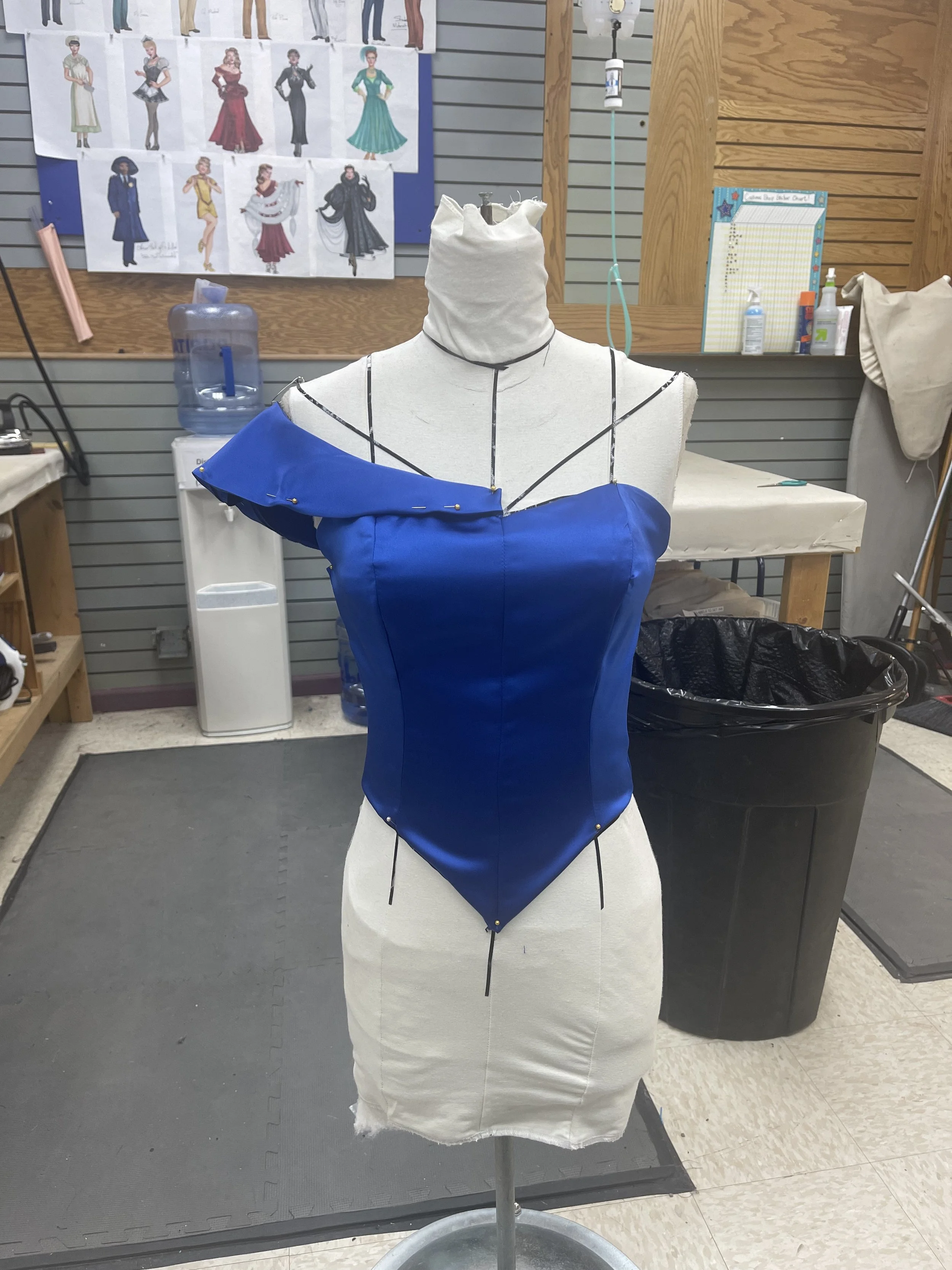 As one of the Drapers for this production of Clue, I was in charge of patterning Miss Scarlet’s gown, Cook’s dress and apron (which was removable), and the Telegram Girl’s outfit (which included matching gold tap shorts and buttons around the trim of the front bib—the photo to the right is a progress shot). I created the patterns and adjusted each for 2 understudies per character. I also assisted with construction on the Maids and alterations on the menswear.
